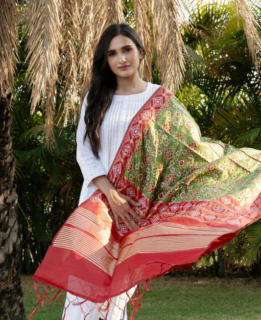 Traditional Silk Patola Dupatta [Dark Green & Red]