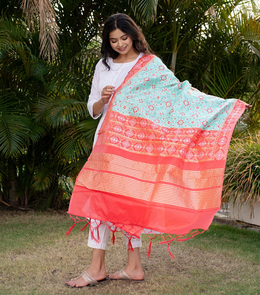 Traditional Silk Patola Dupatta [Turquoise & Red]