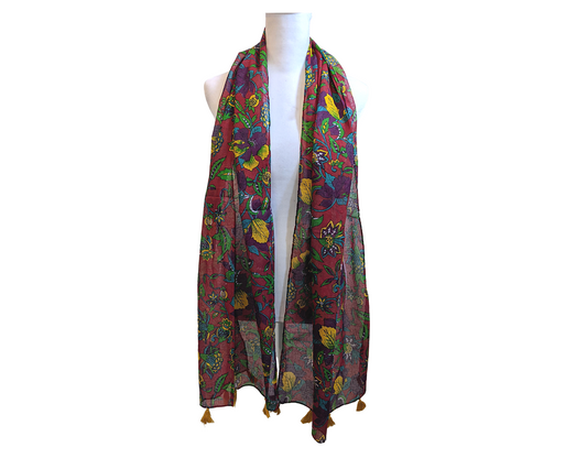 Red Multicolored Floral Cotton Scarf | Yellow Tassels