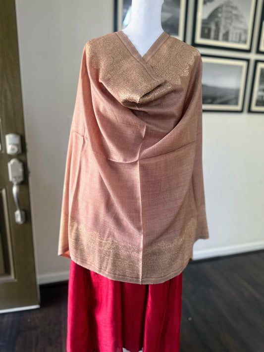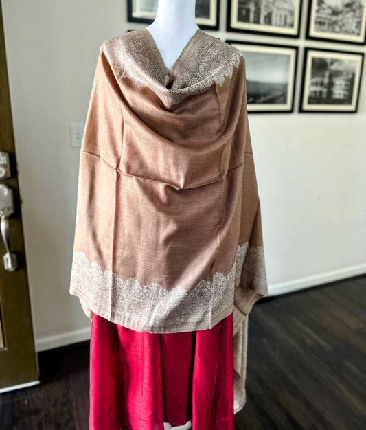 Pashmina Wool Beige Scarf For Women and Men With Gold Zari Border, Finest Quality Kashmiri Shawl