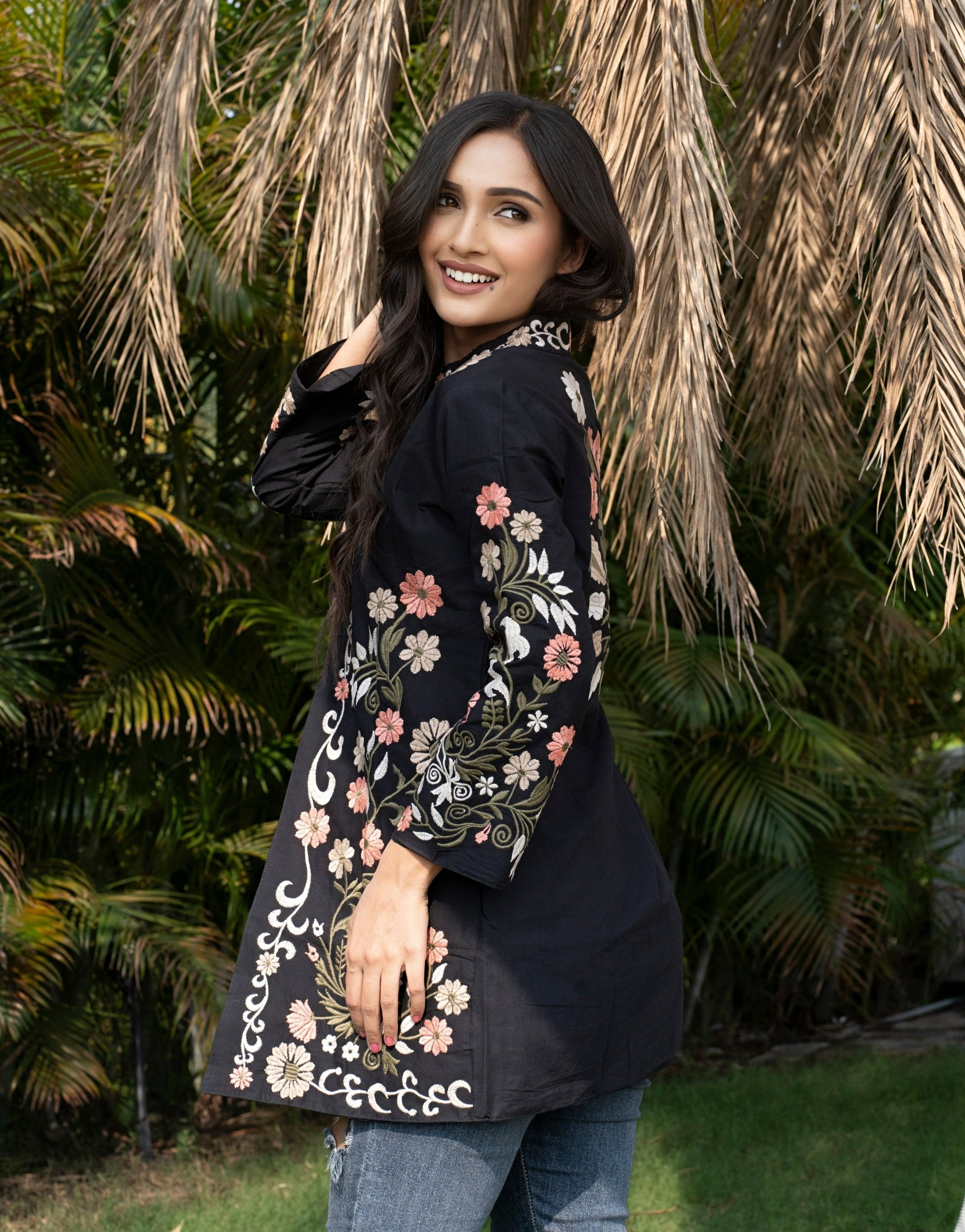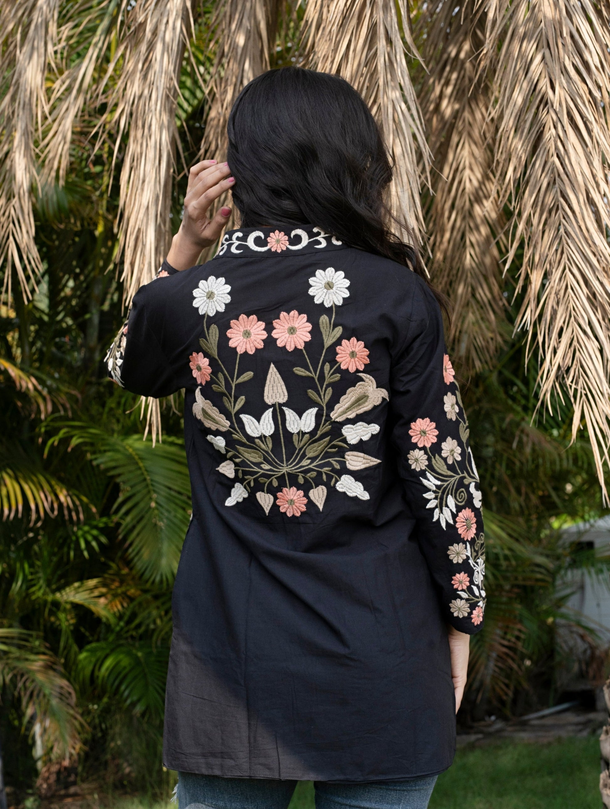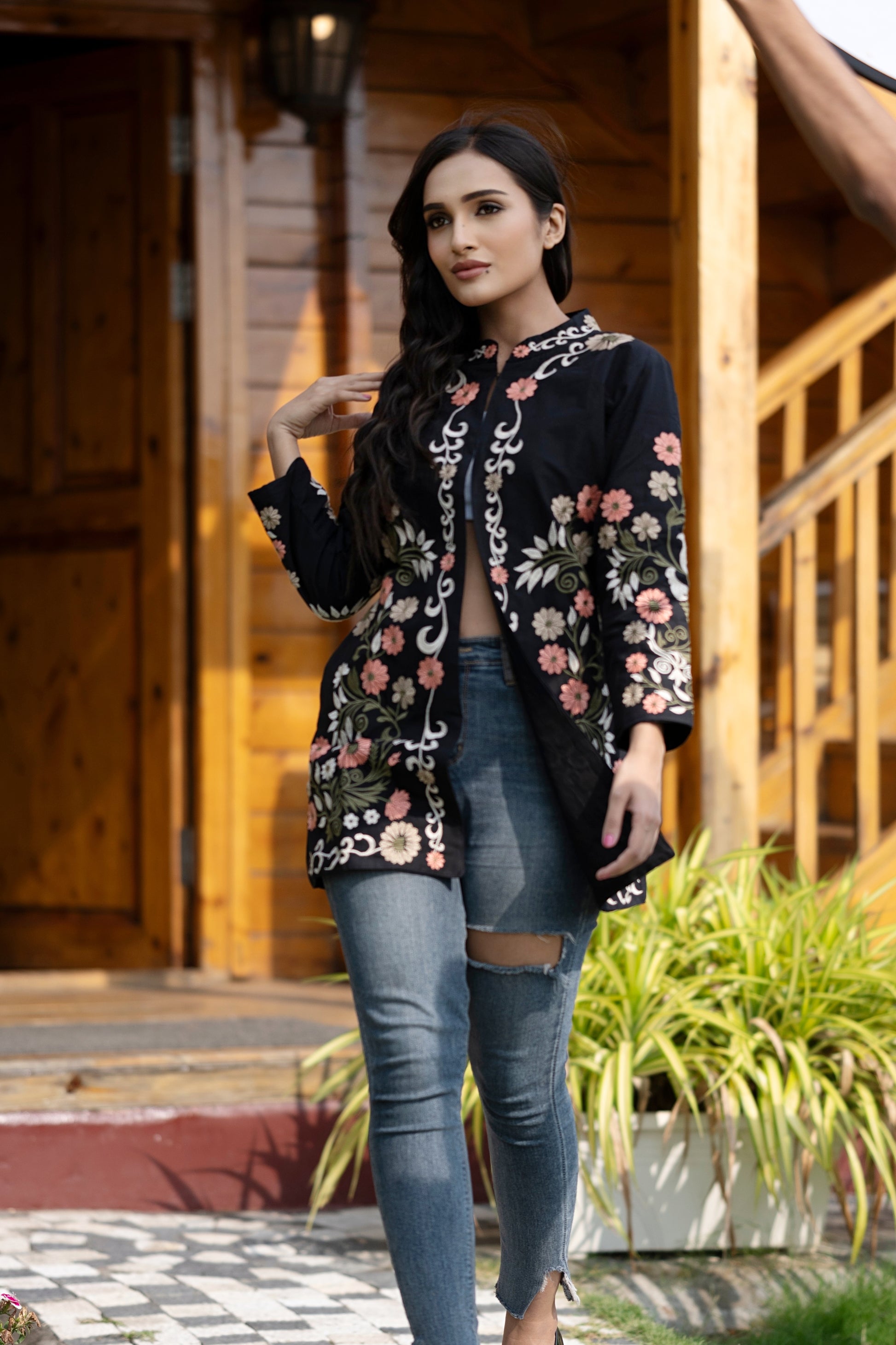Style tip: Dress up your Kutch jacket with simple solid bottoms like a plain skirt or tailored pants, or even denim shorts, letting the patterns and vibrant colors stand out. Layer the embroidered jacket over a monochrome dress or make it a standout piece by wearing it with denim.