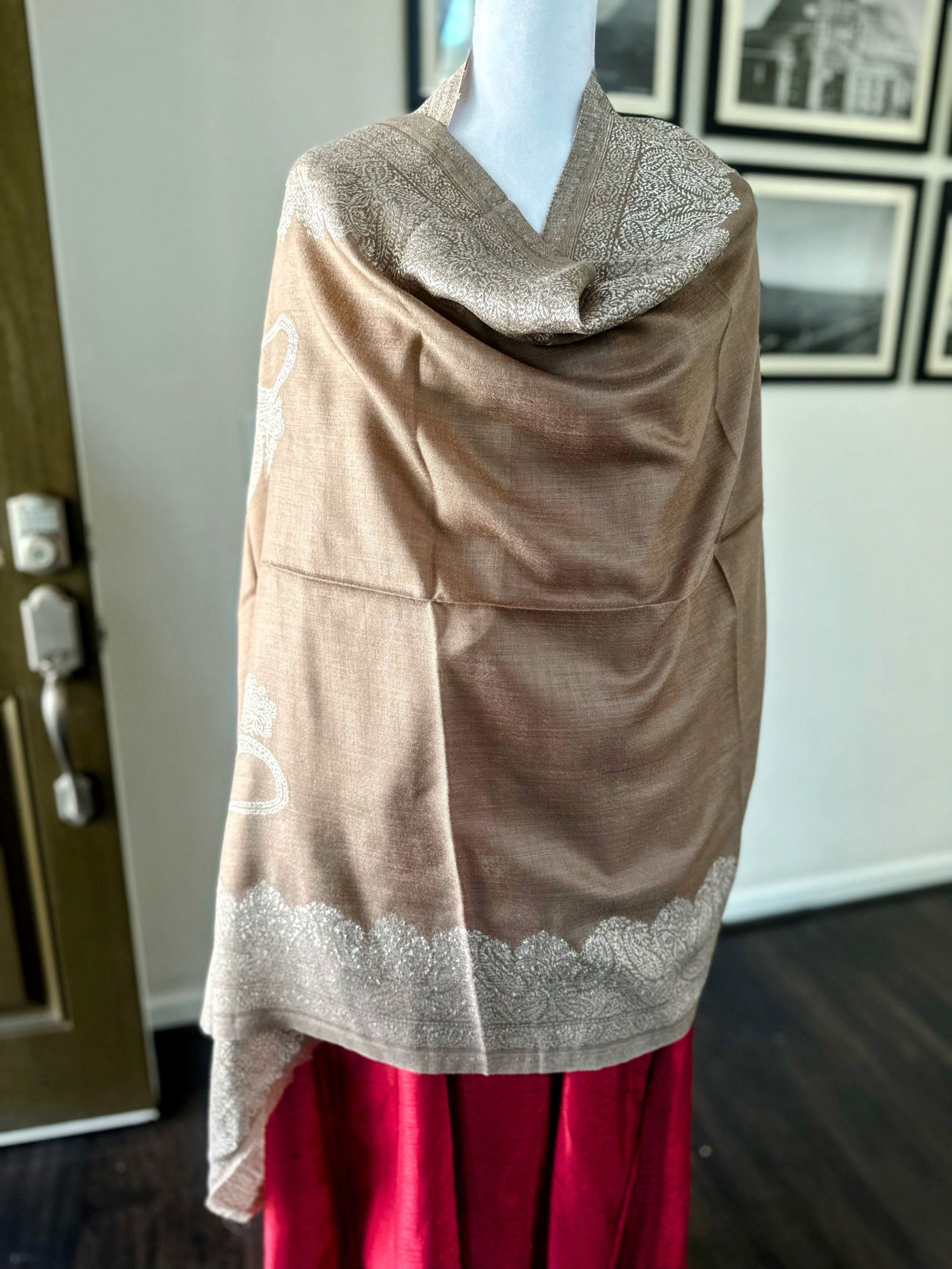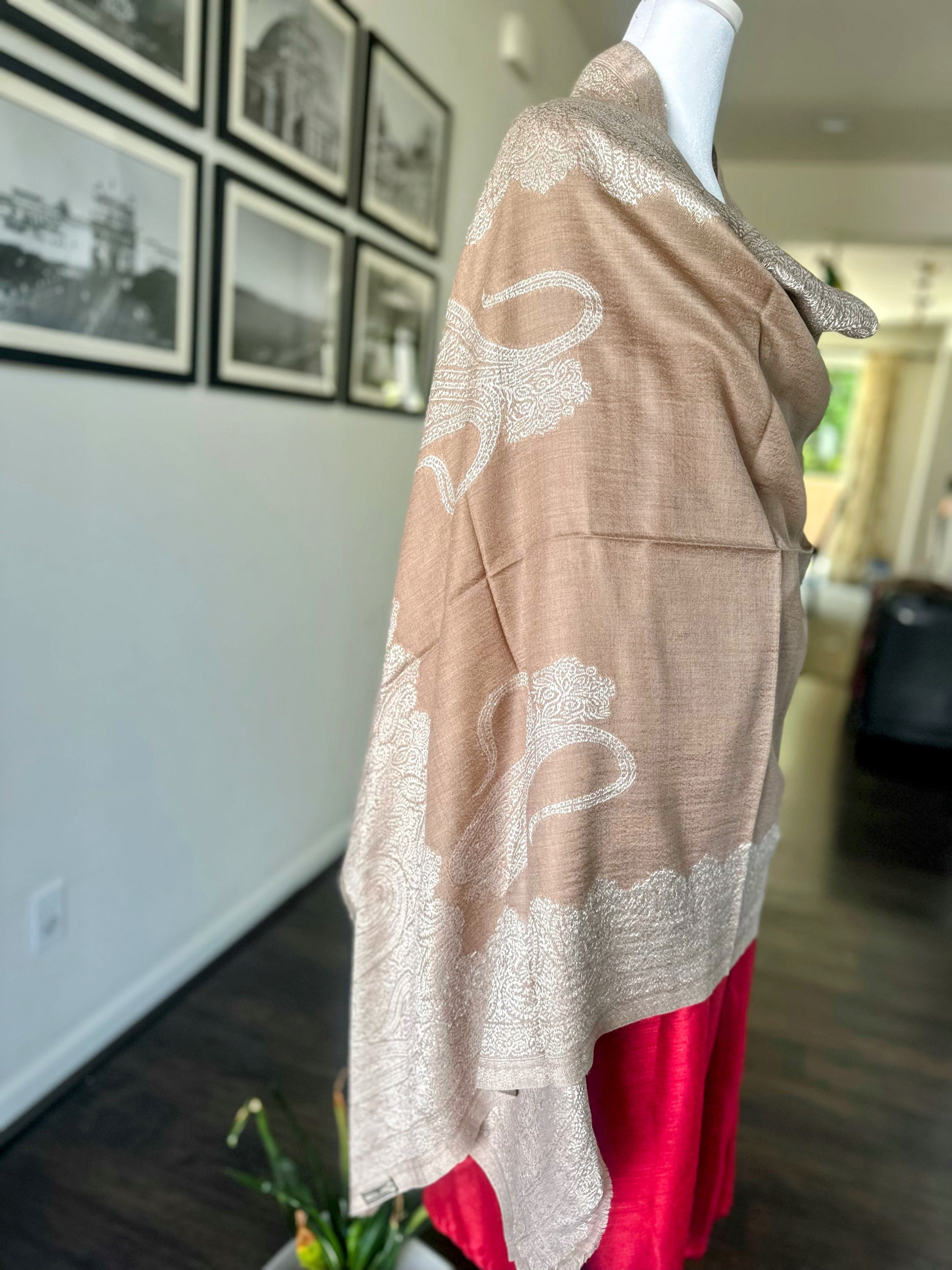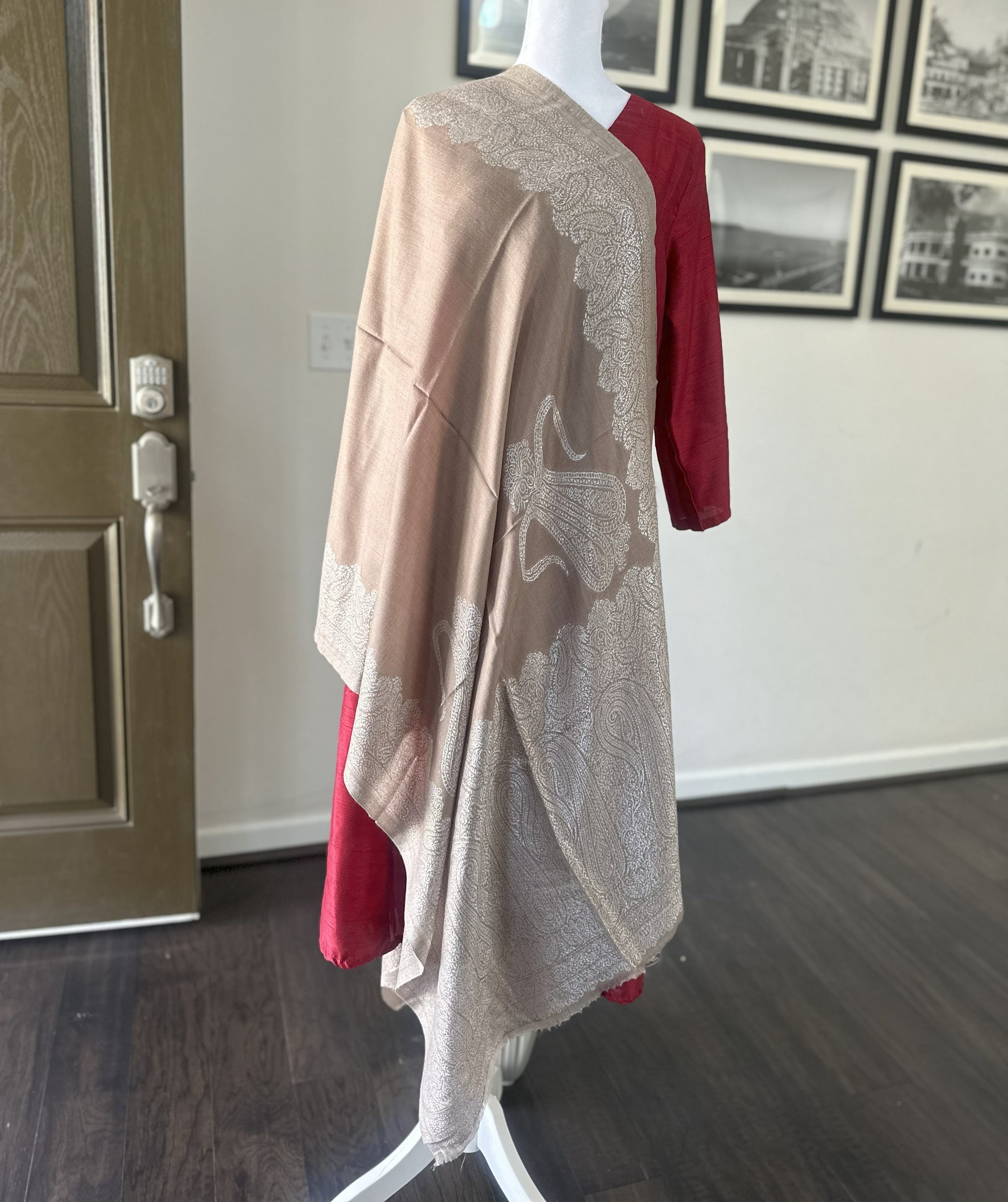 Pashmina Wool Beige Scarf For Women and Men With Gold Zari Border, Finest Quality Kashmiri Shawl