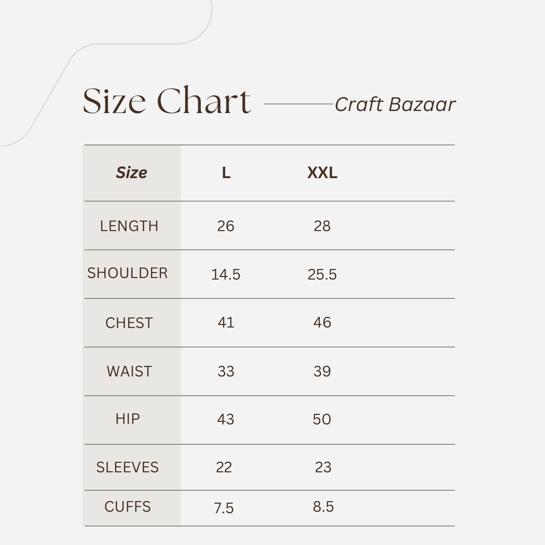 -Model: Pallavi is 5'5", and wearing size L. She measures Bust 34”, Waist 25”, and Hips 36”
