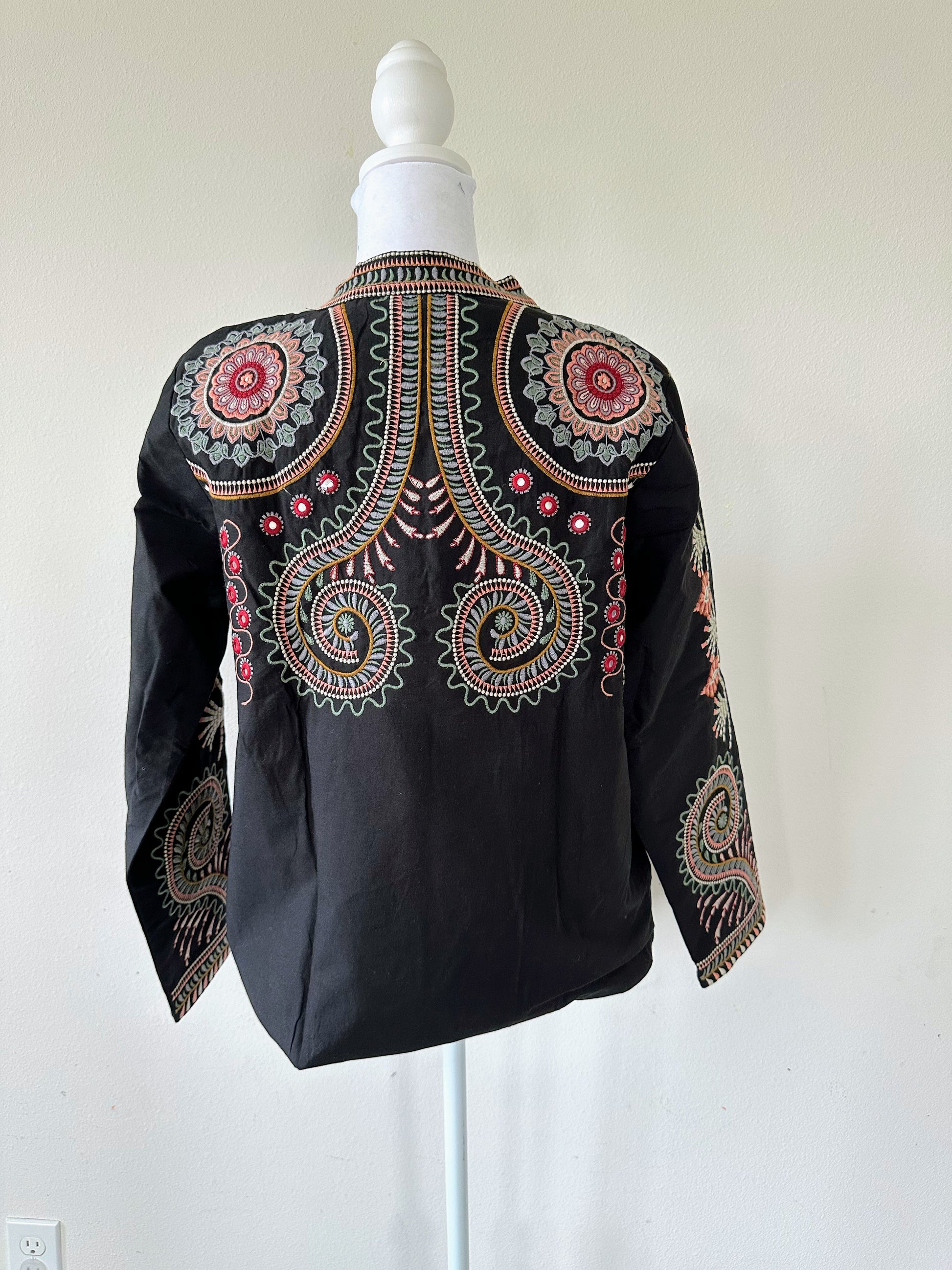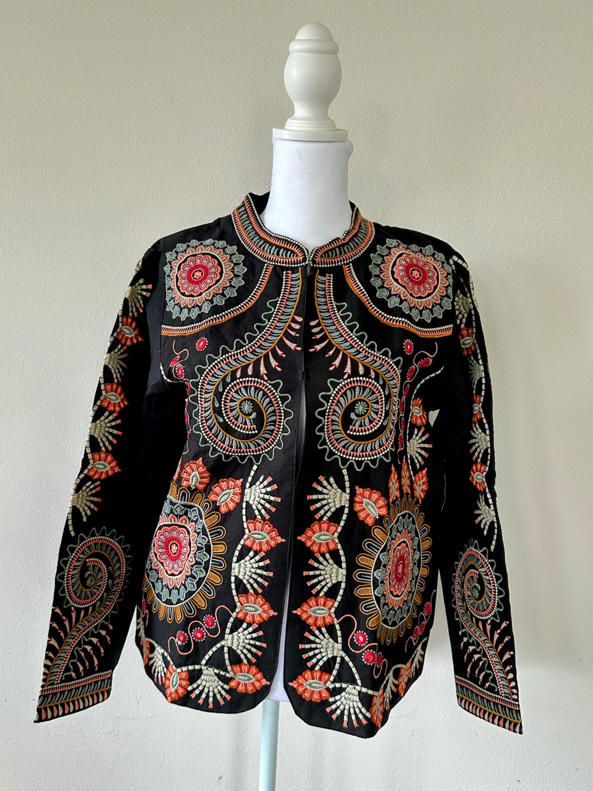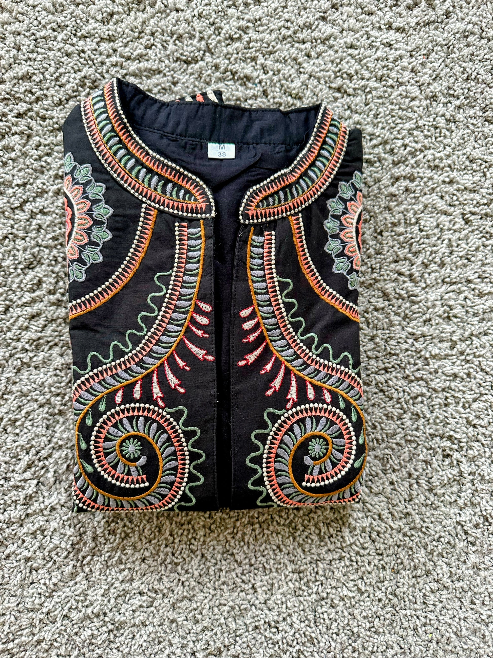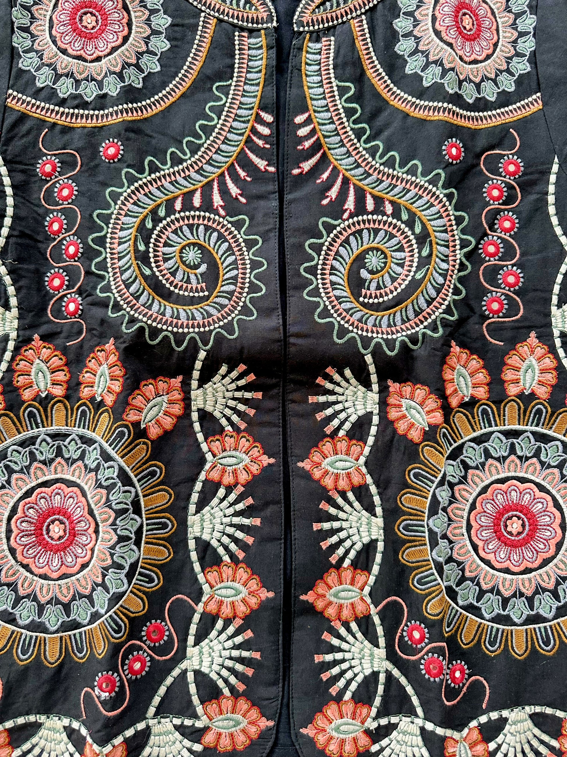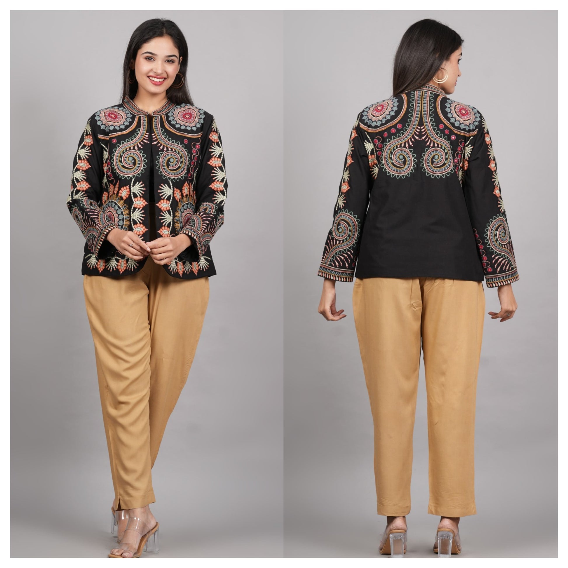 Style tip: Dress up your Kutch jacket with simple solid bottoms like a plain skirt or tailored pants, or even denim shorts, letting the patterns and vibrant colors stand out. Layer the embroidered jacket over a monochrome dress or make it a standout piece by wearing it with denim.