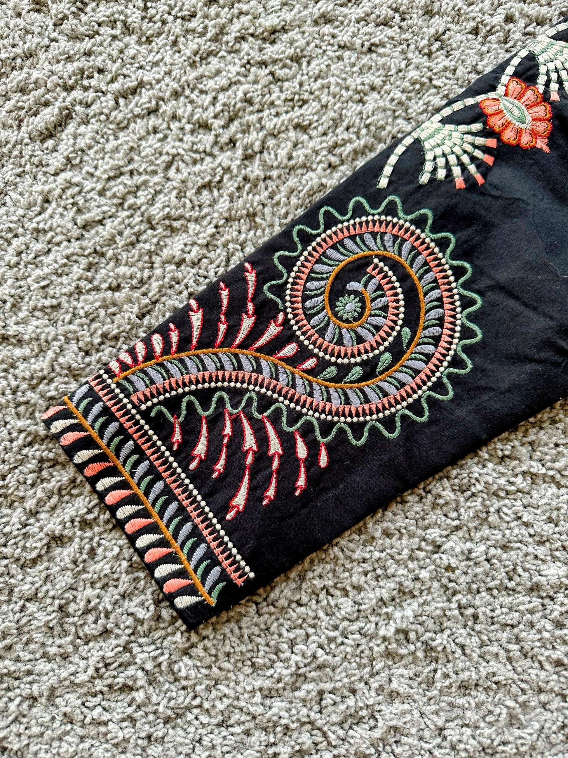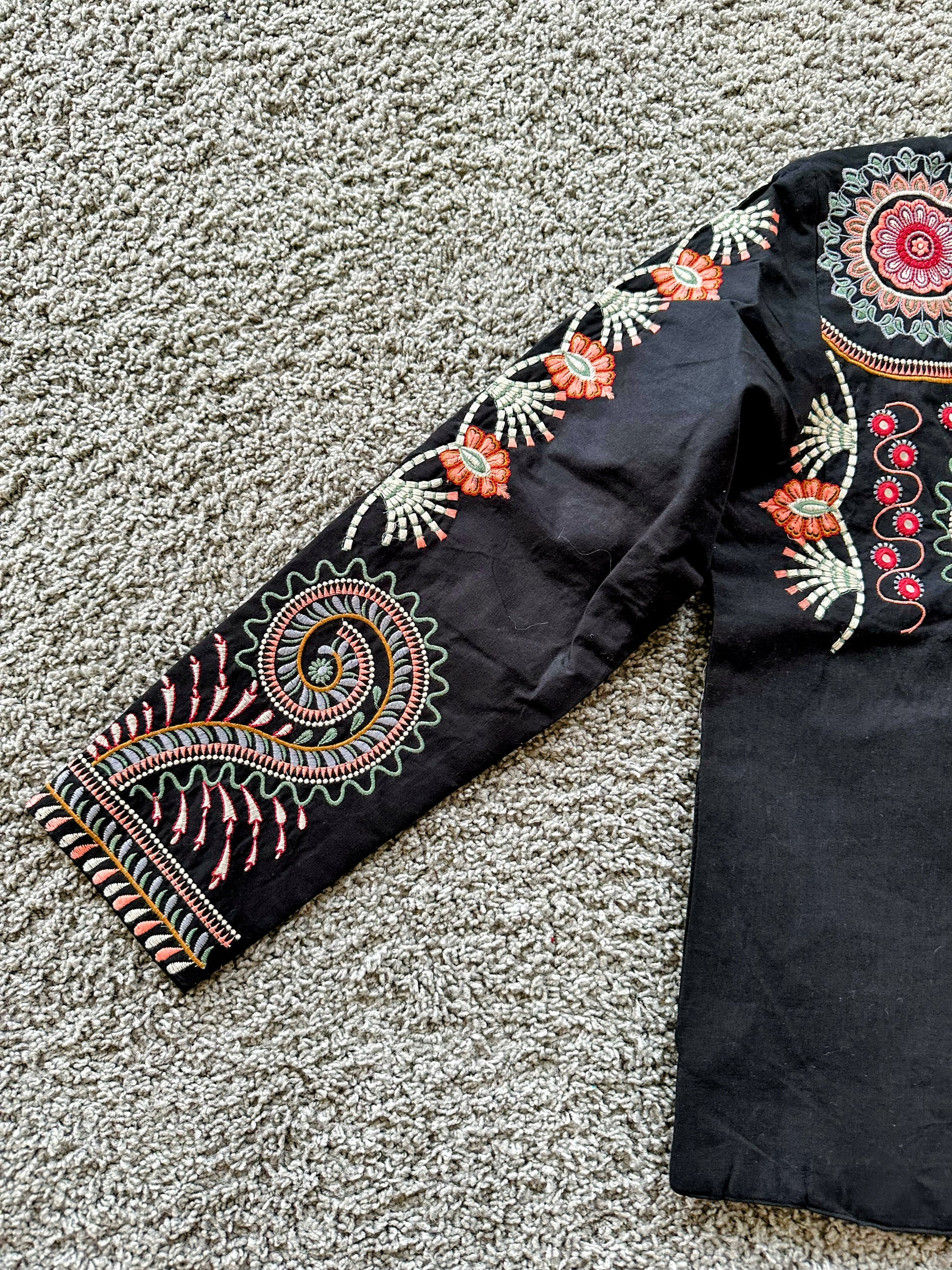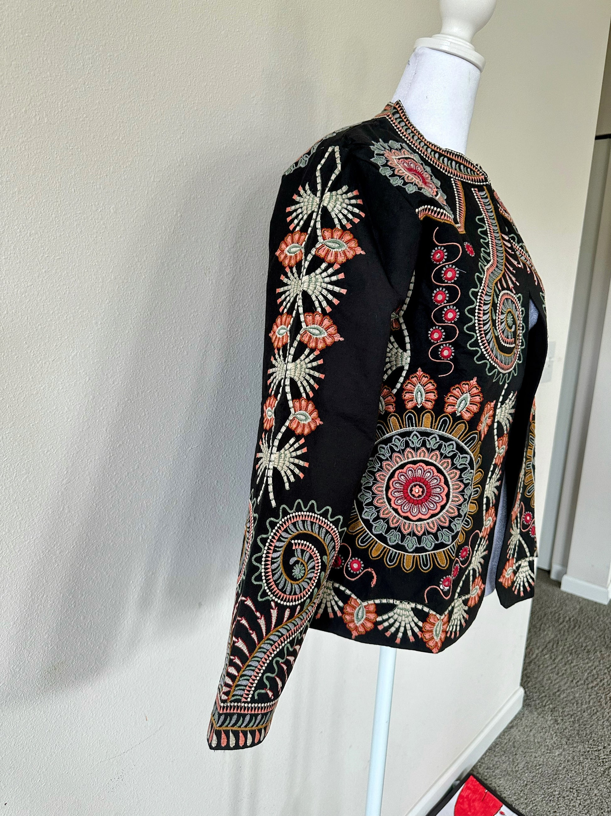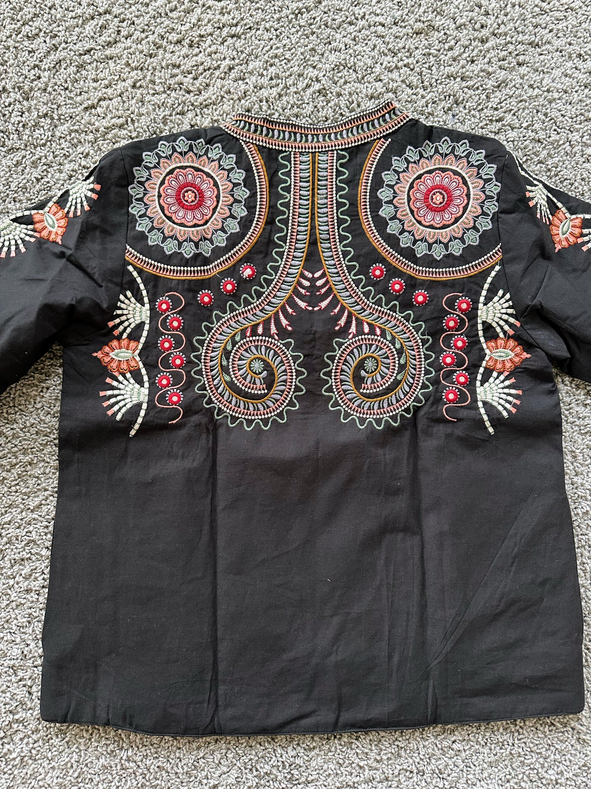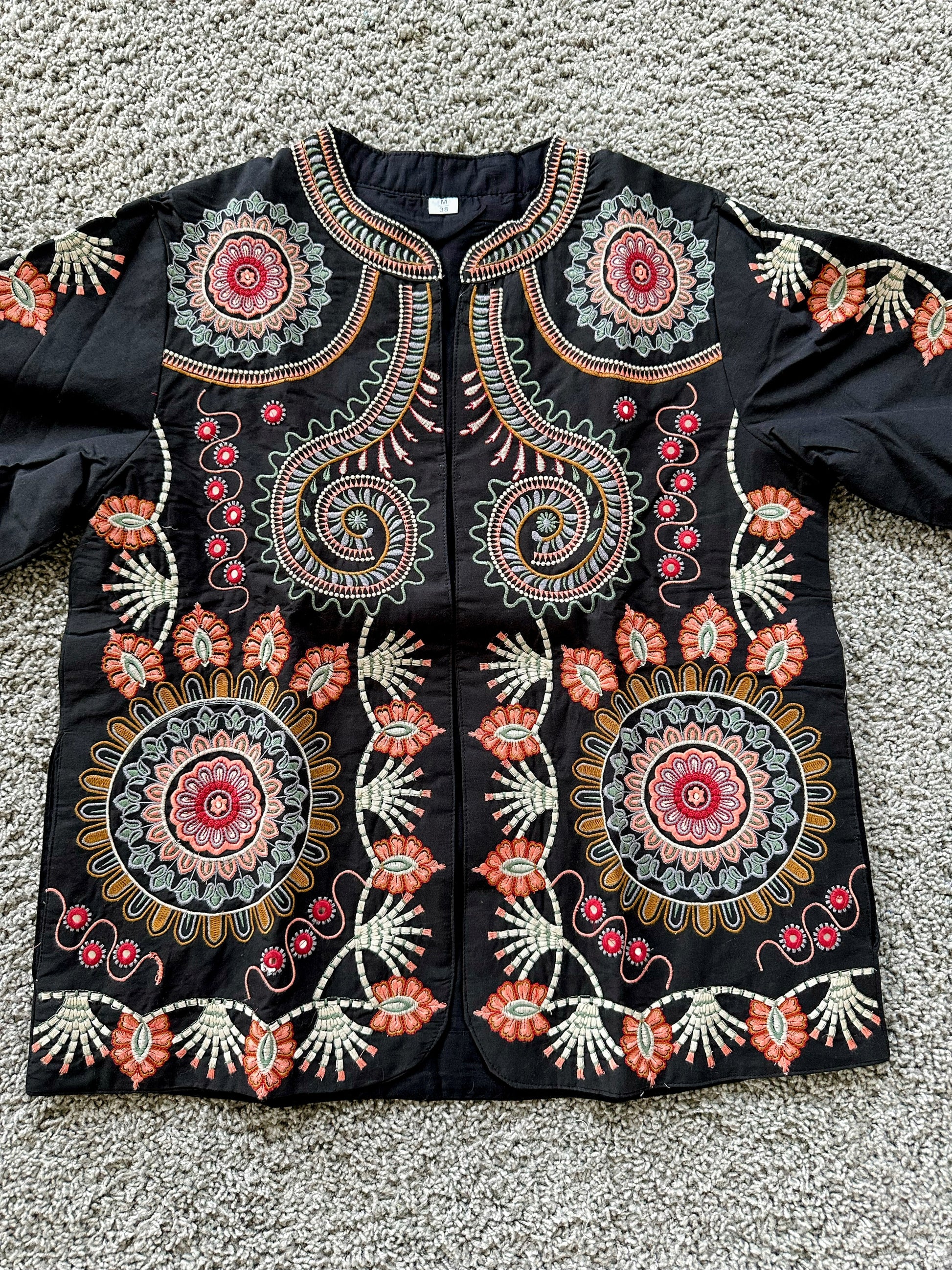 Style tip: Dress up your Kutch jacket with simple solid bottoms like a plain skirt or tailored pants, or even denim shorts, letting the patterns and vibrant colors stand out. Layer the embroidered jacket over a monochrome dress or make it a standout piece by wearing it with denim.