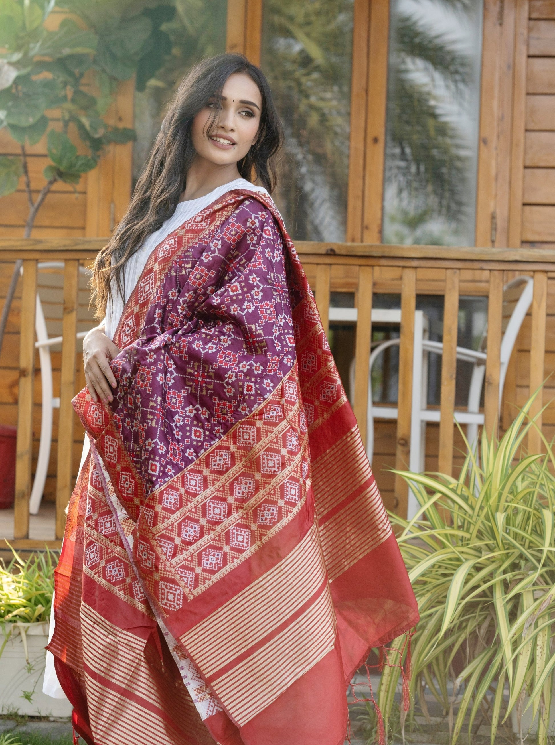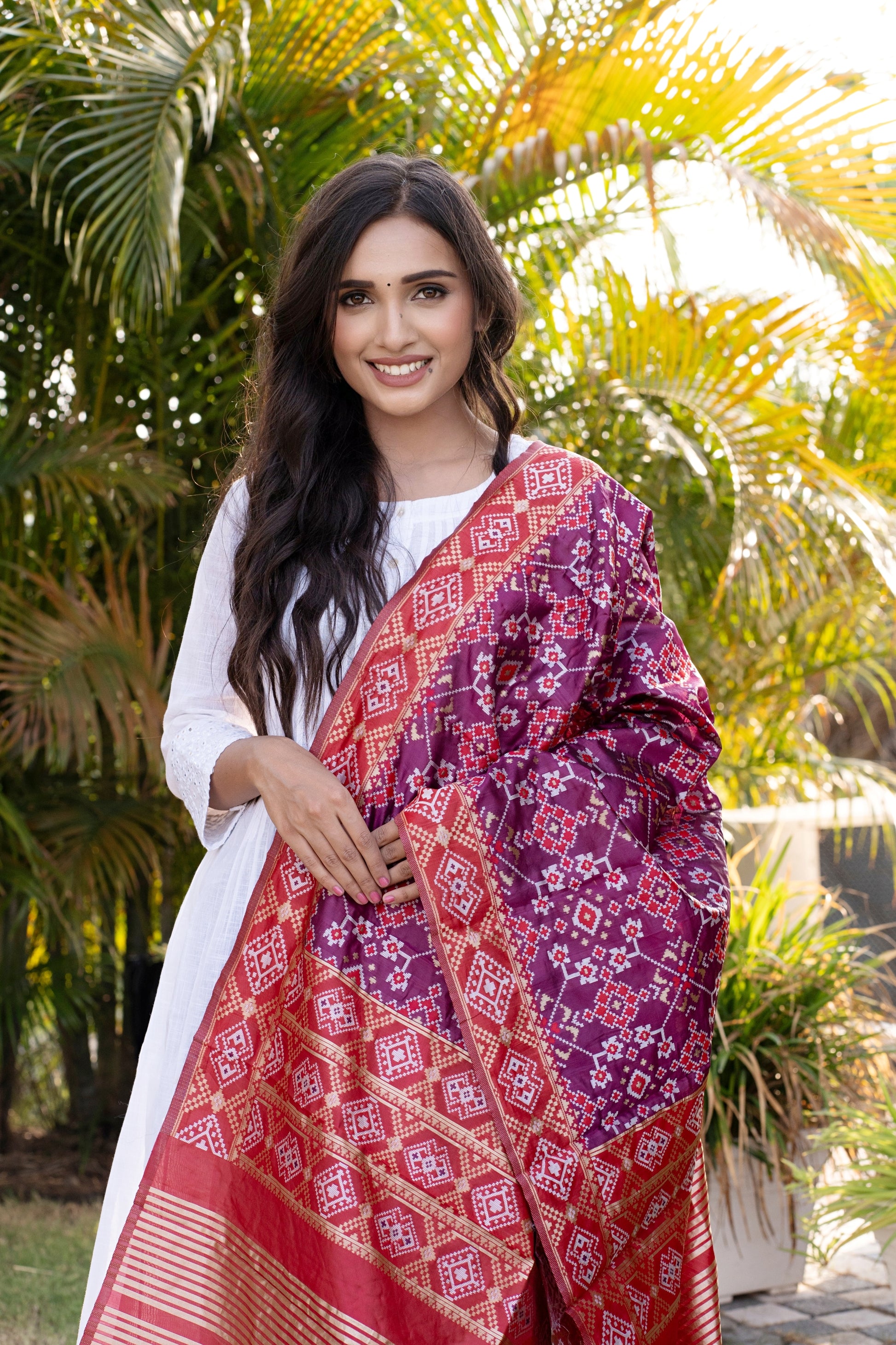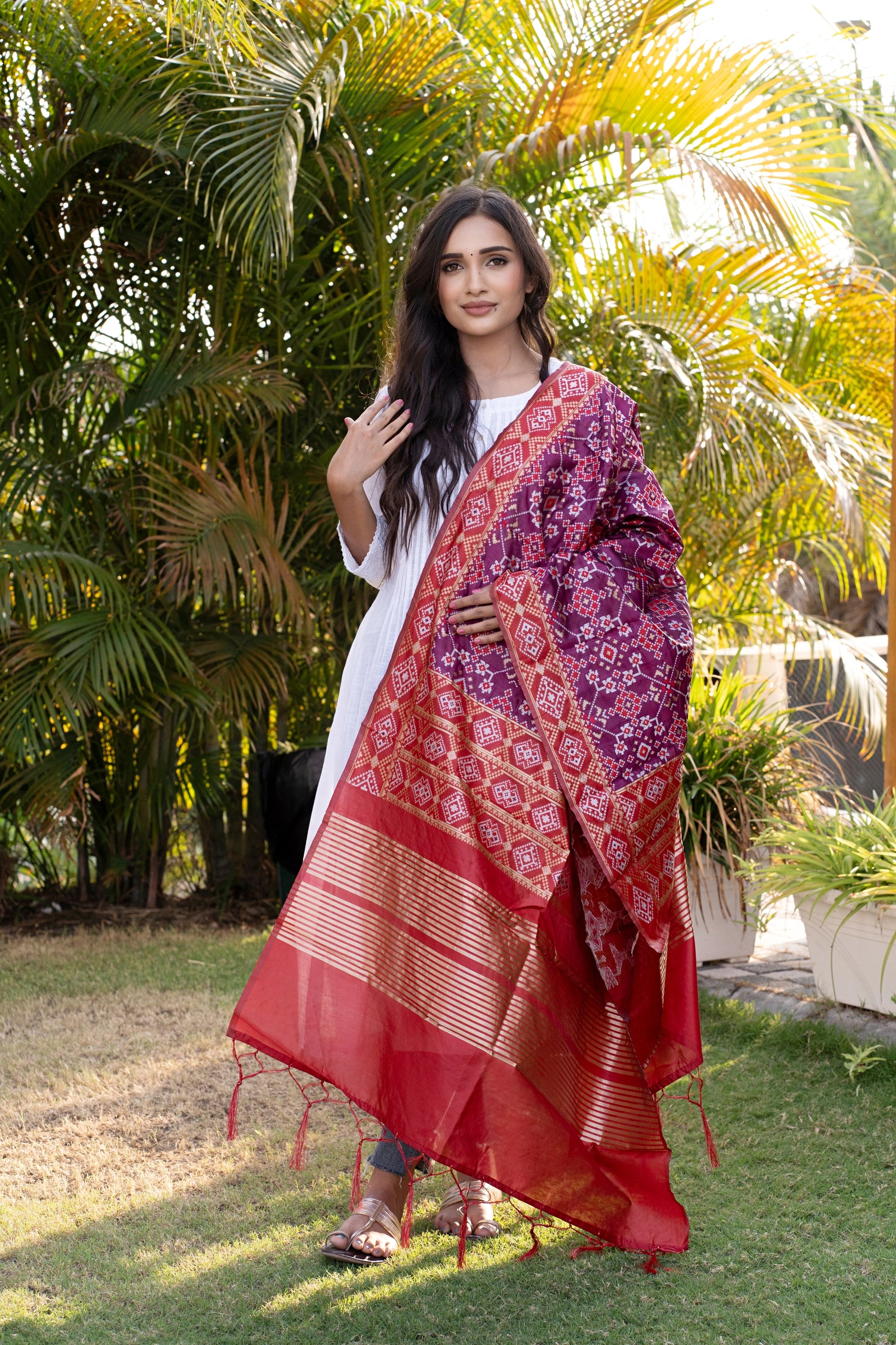 Our soft and luxurious Patola cotton-silk dupatta, is perfect for any occasion. This dupatta is the perfect accessory to add a touch of glamor to your outfit. Elevate your fashion game with this gorgeous and fashionable dupatta that is sure to turn heads.