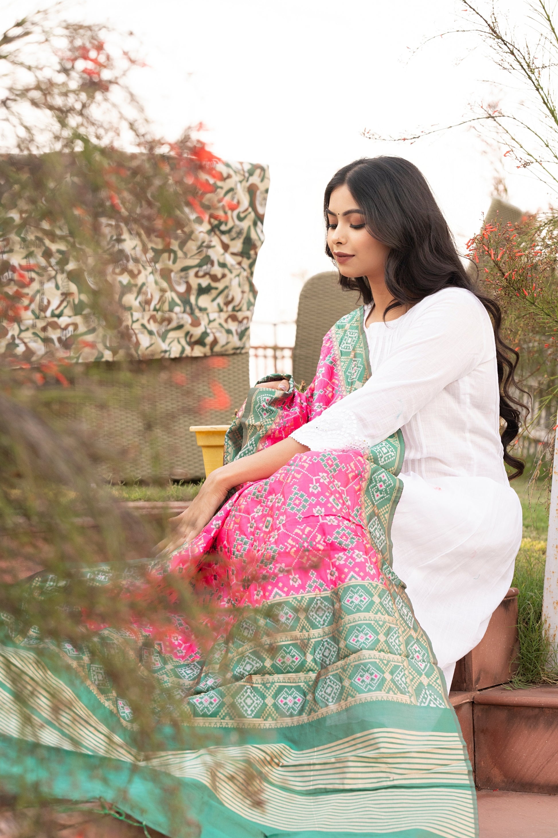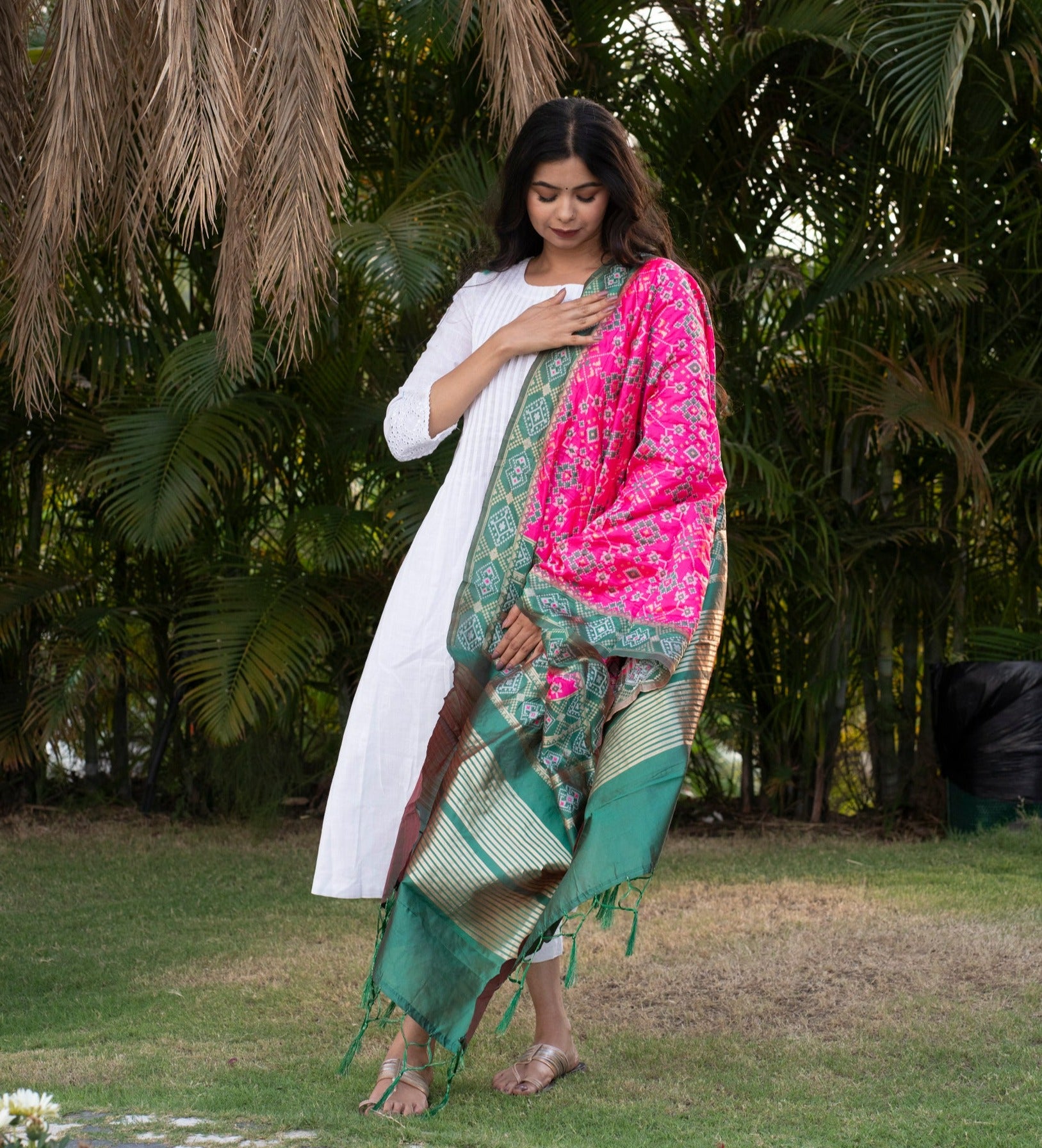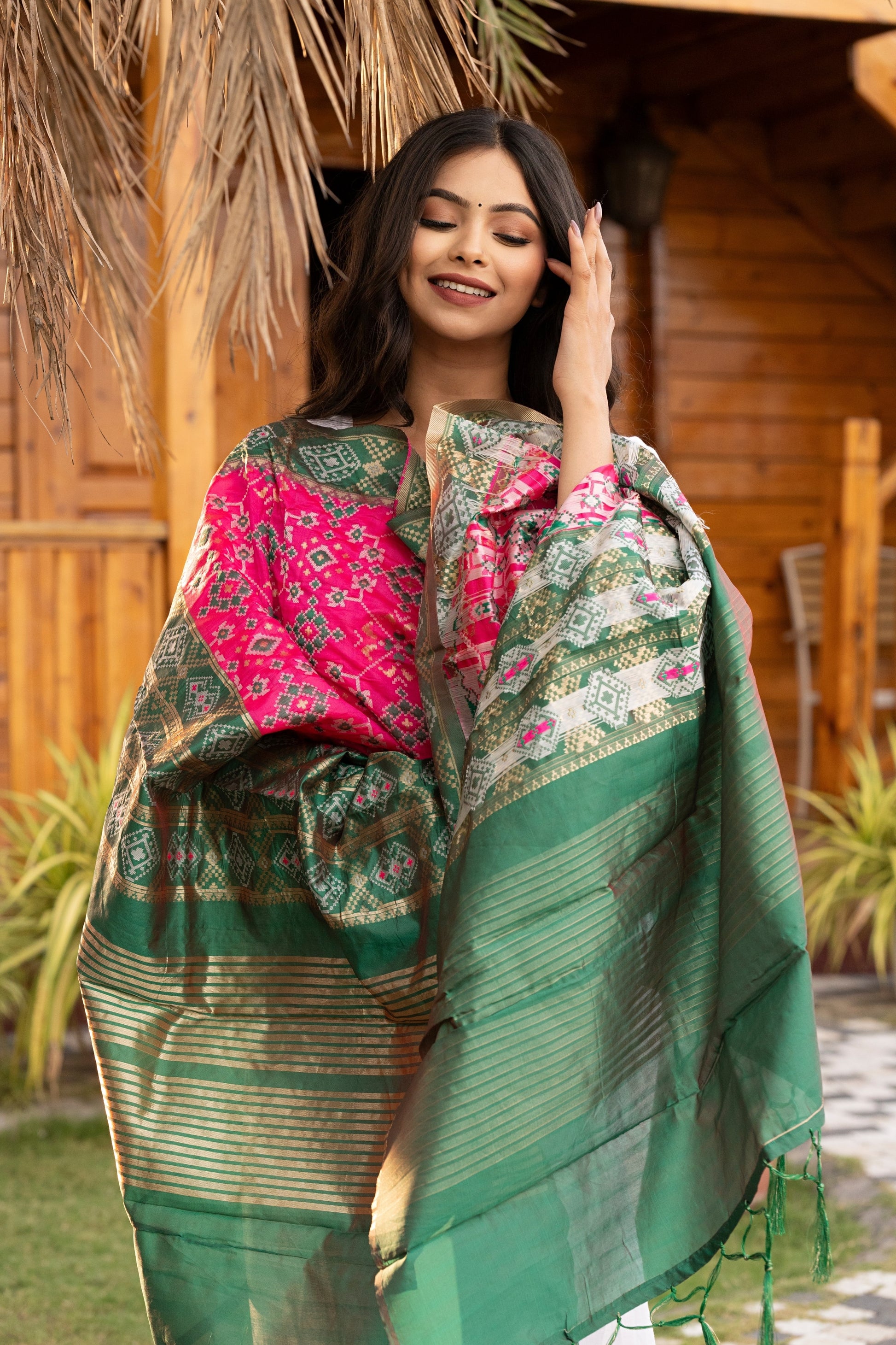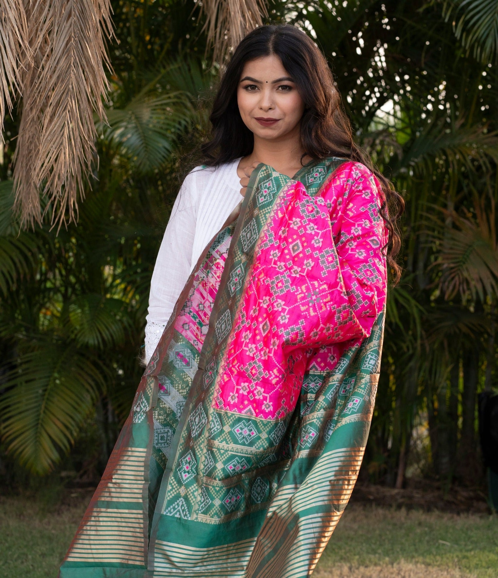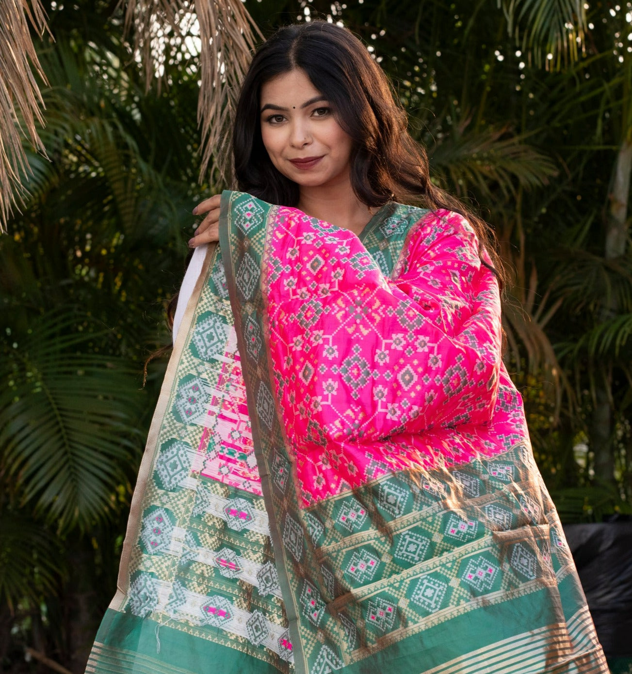Traditional Silk Patola Dupatta [Hot Pink & Green]