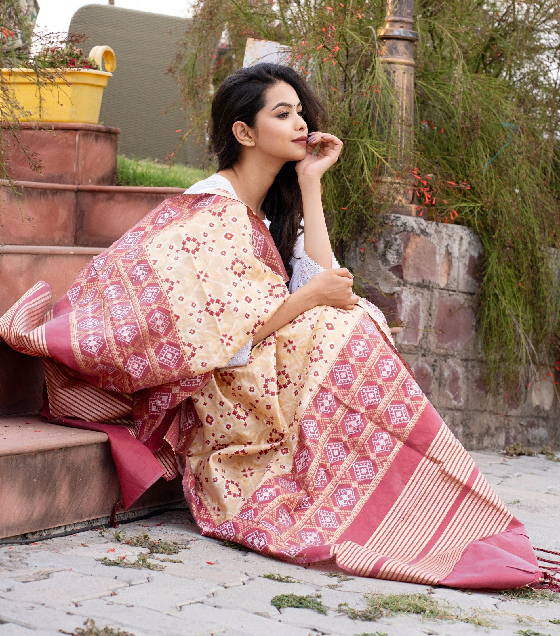 Our soft and luxurious Patola cotton-silk dupatta, is perfect for any occasion. This dupatta is the perfect accessory to add a touch of glamor to your outfit. Elevate your fashion game with this gorgeous and fashionable dupatta that is sure to turn heads.