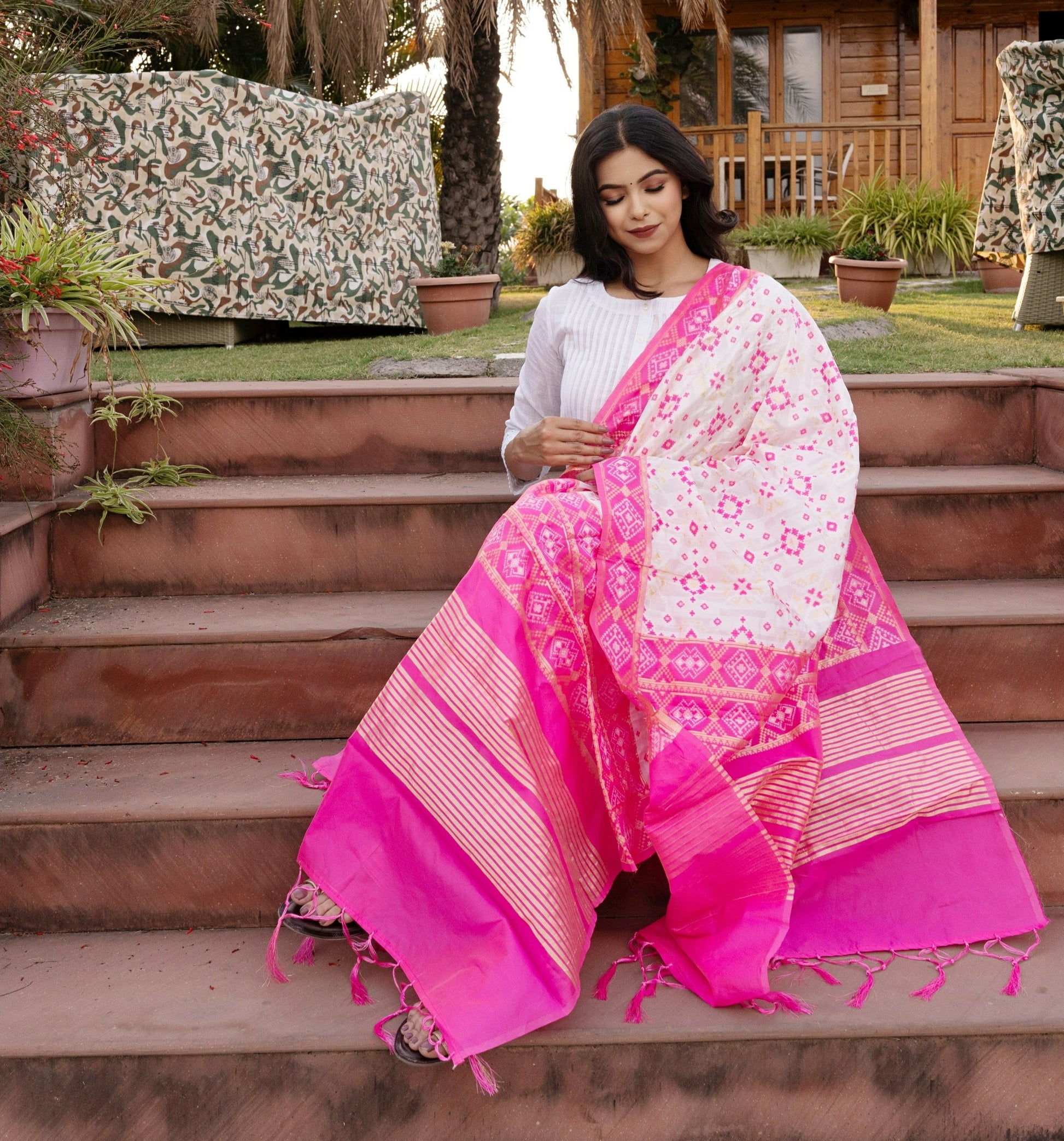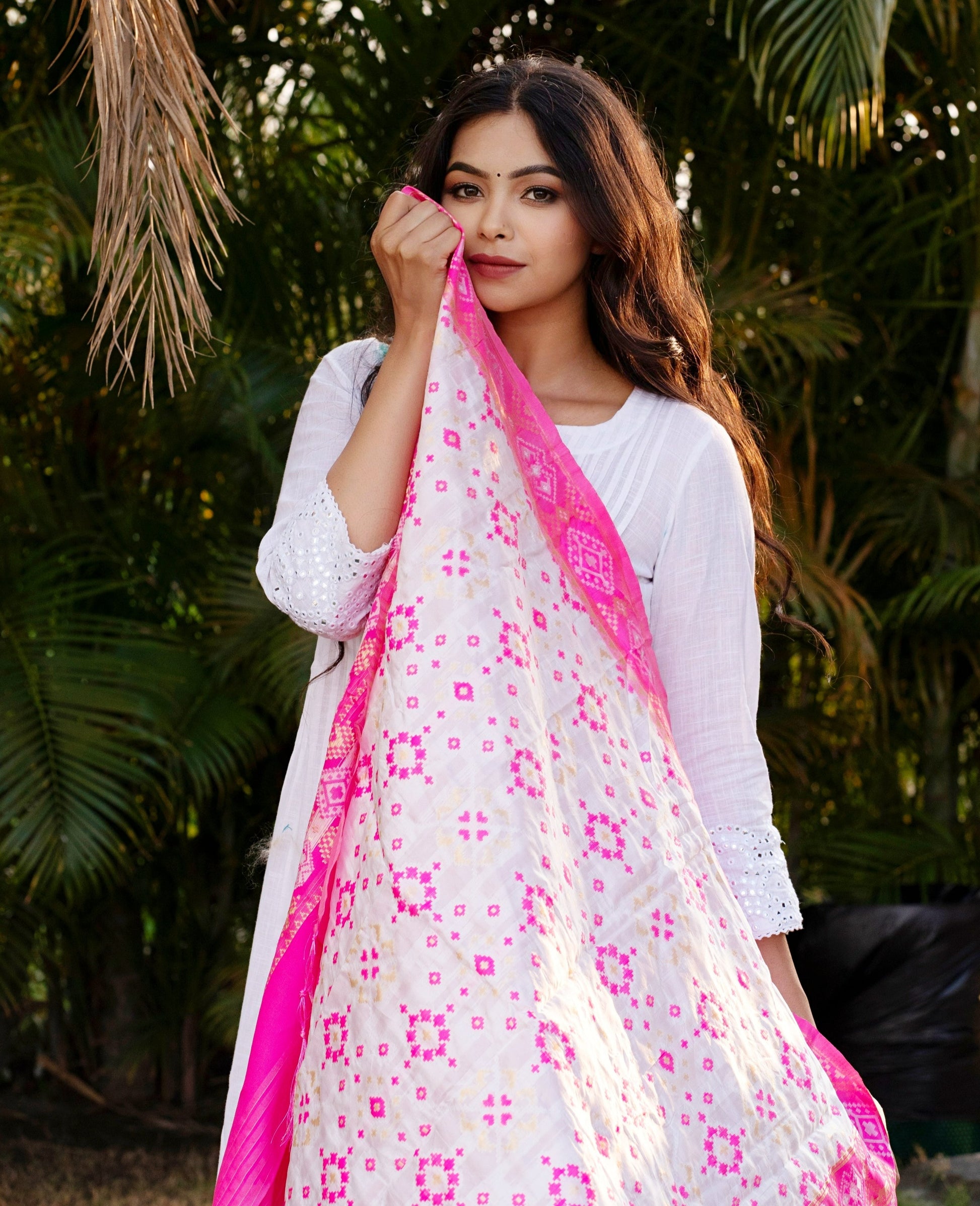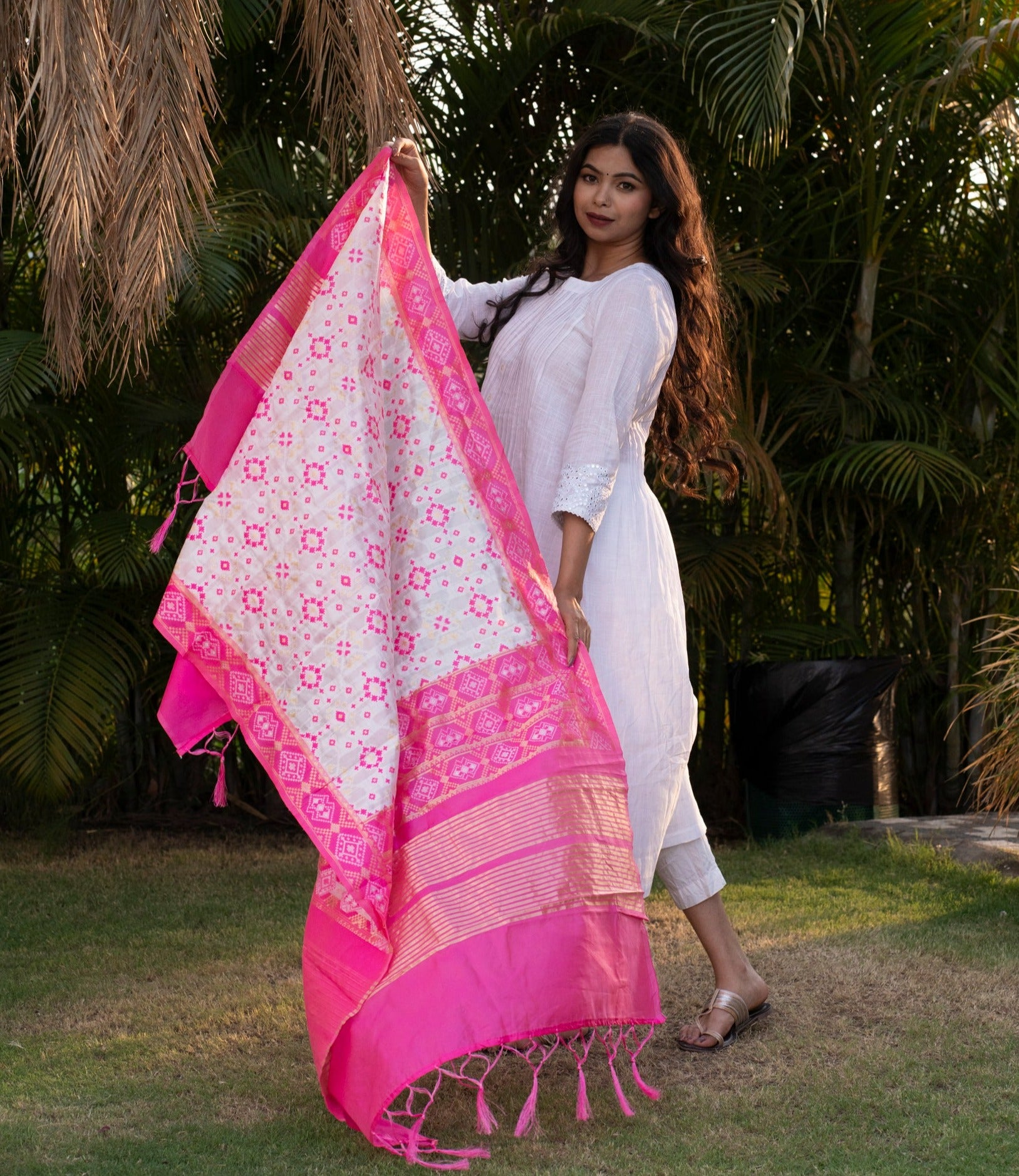 Traditional Silk Patola Dupatta [White & Pink]