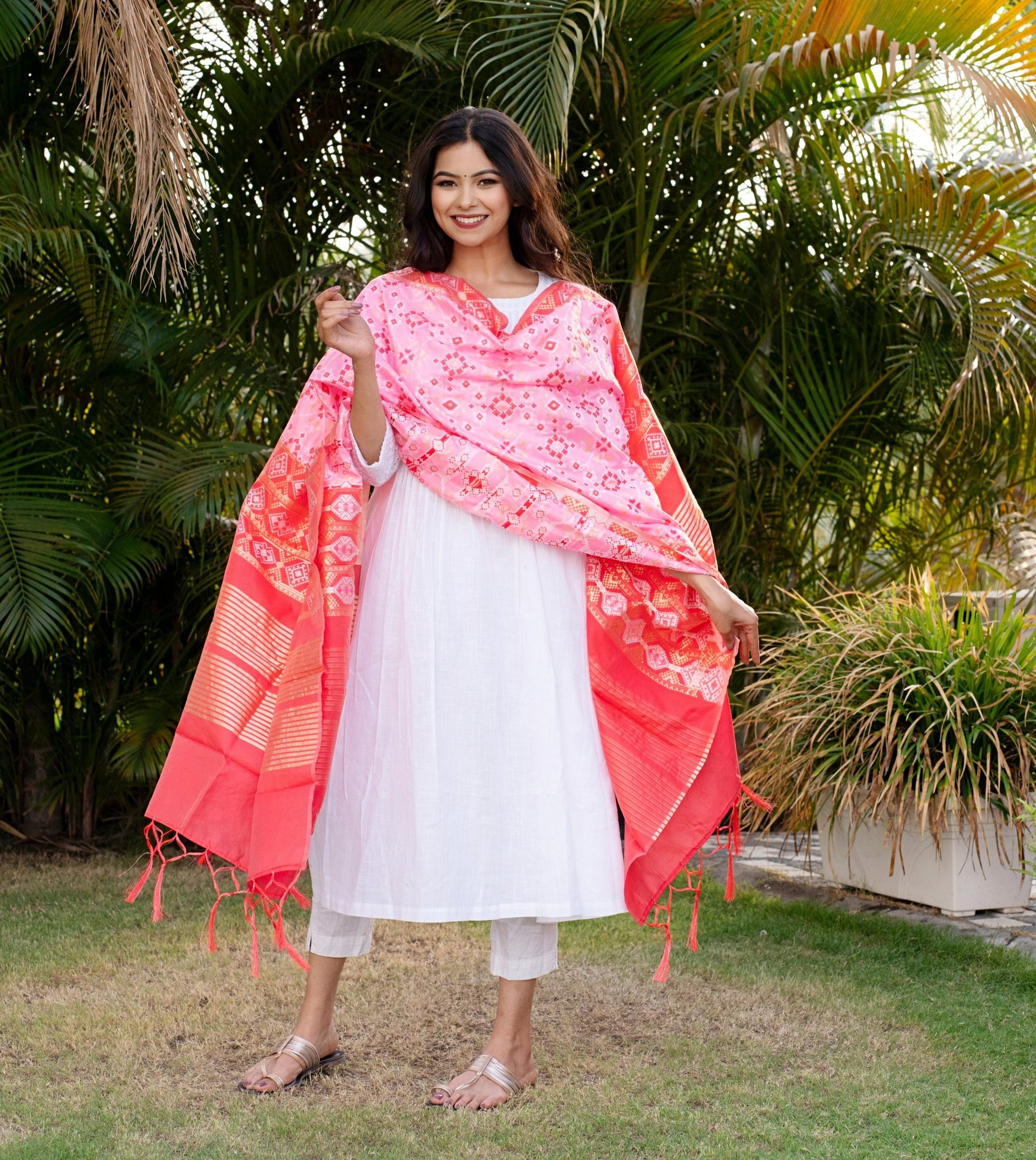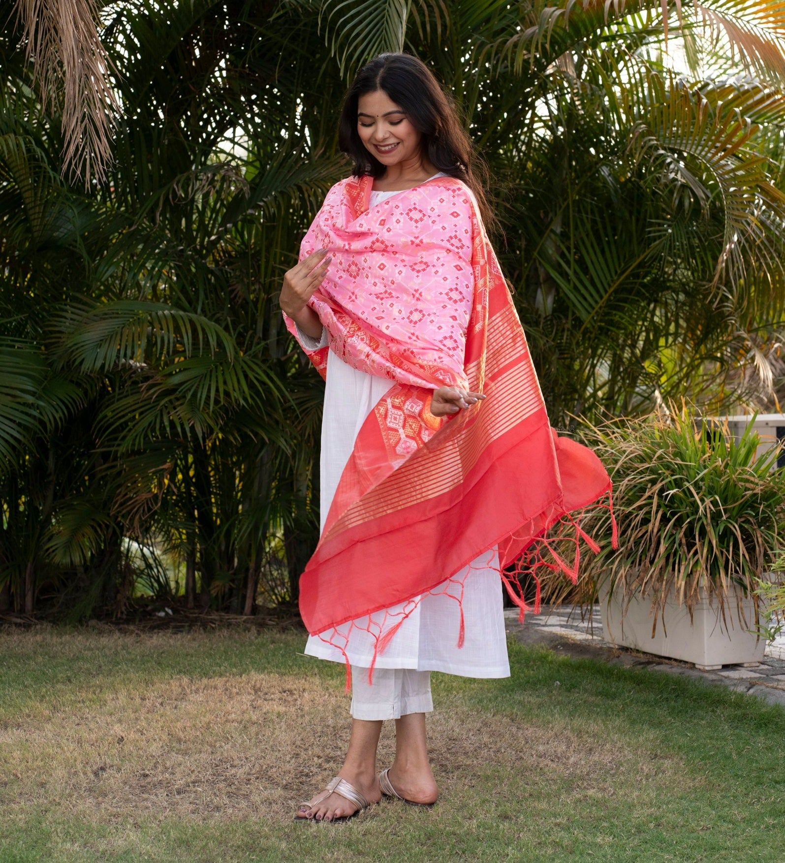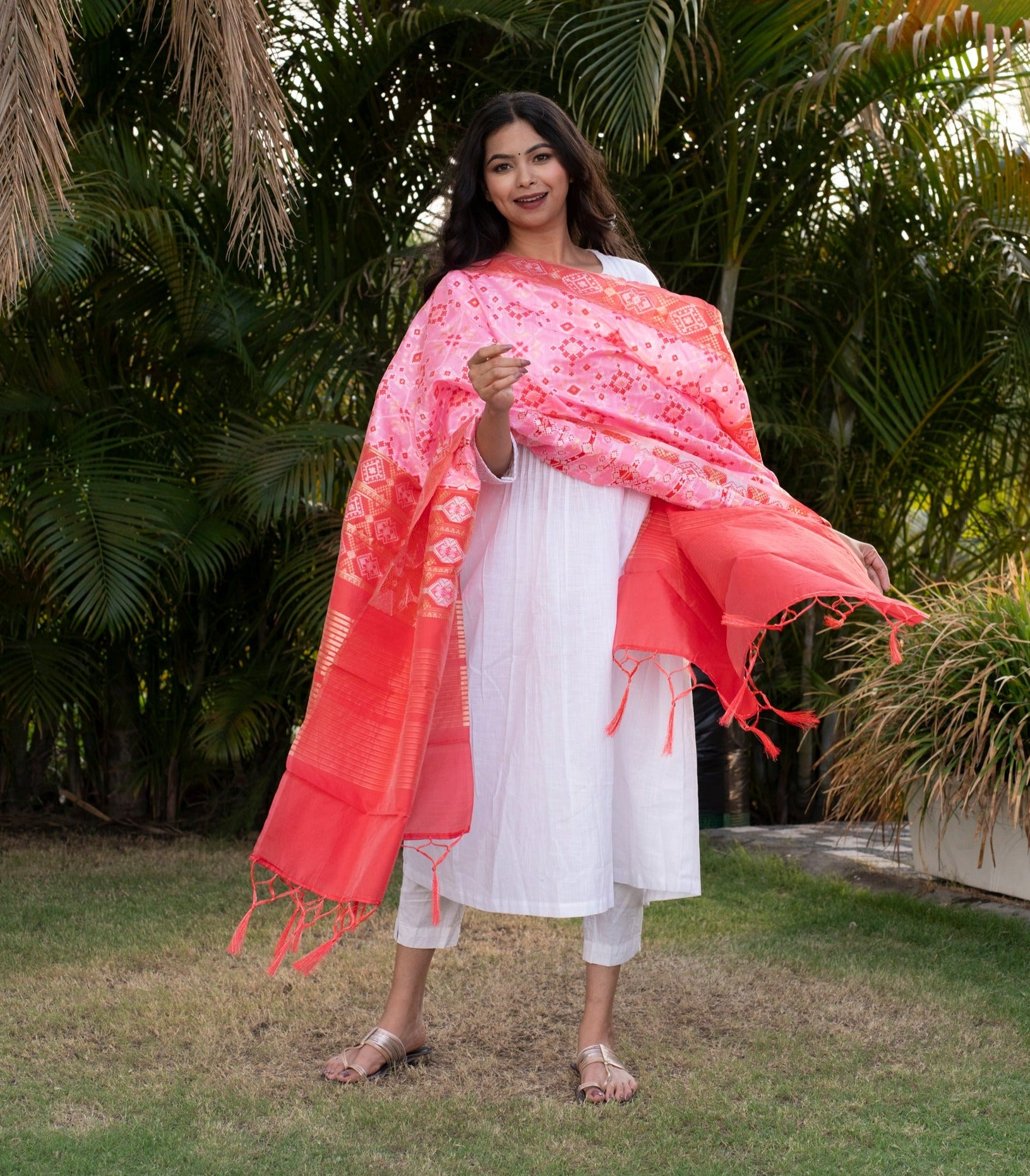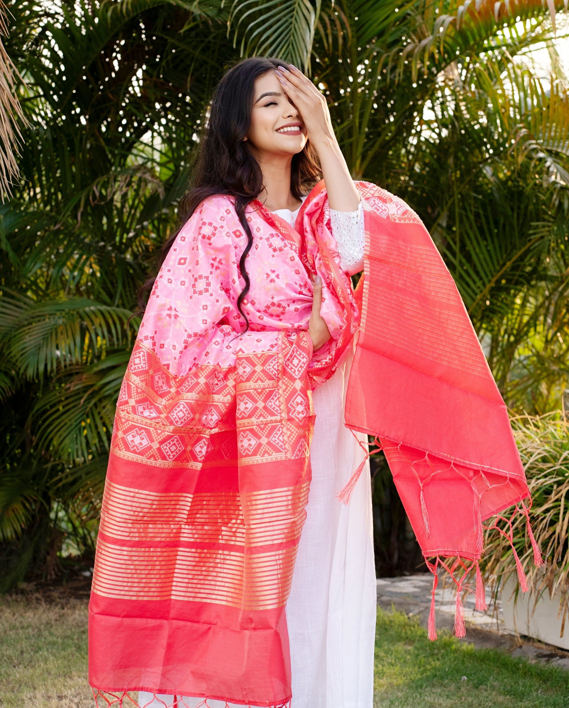 Our soft and luxurious Patola cotton-silk dupatta, is perfect for any occasion. This dupatta is the perfect accessory to add a touch of glamor to your outfit. Elevate your fashion game with this gorgeous and fashionable dupatta that is sure to turn heads.